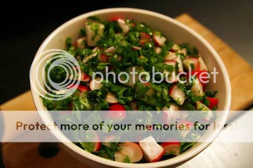 Dar ca sa nu spuna cineva ca bat campii (altought it's obvious), am facut o salata de ridichi, pe care le-am combinat cu cealalta pasiune turbata a mea - patrunjelul (care nu e niciodata suficient, la fel ca si rozmarinul. eh, don't bother keeping track, it's plain weird :P)